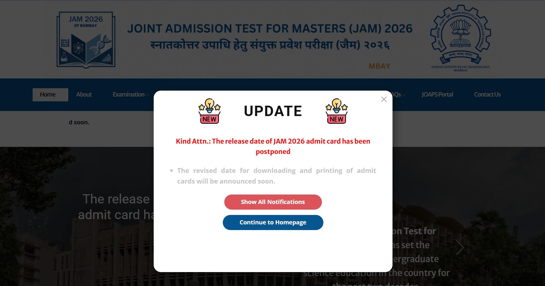 IIT JAM 2026 Hall Ticket release has been postponed by the exam officials. Earlier IIT Bombay has mentioned the JAM 2026 admit card release date to be January 5, 2026. The new updated hall ticket release date will be notified soon by the officials.